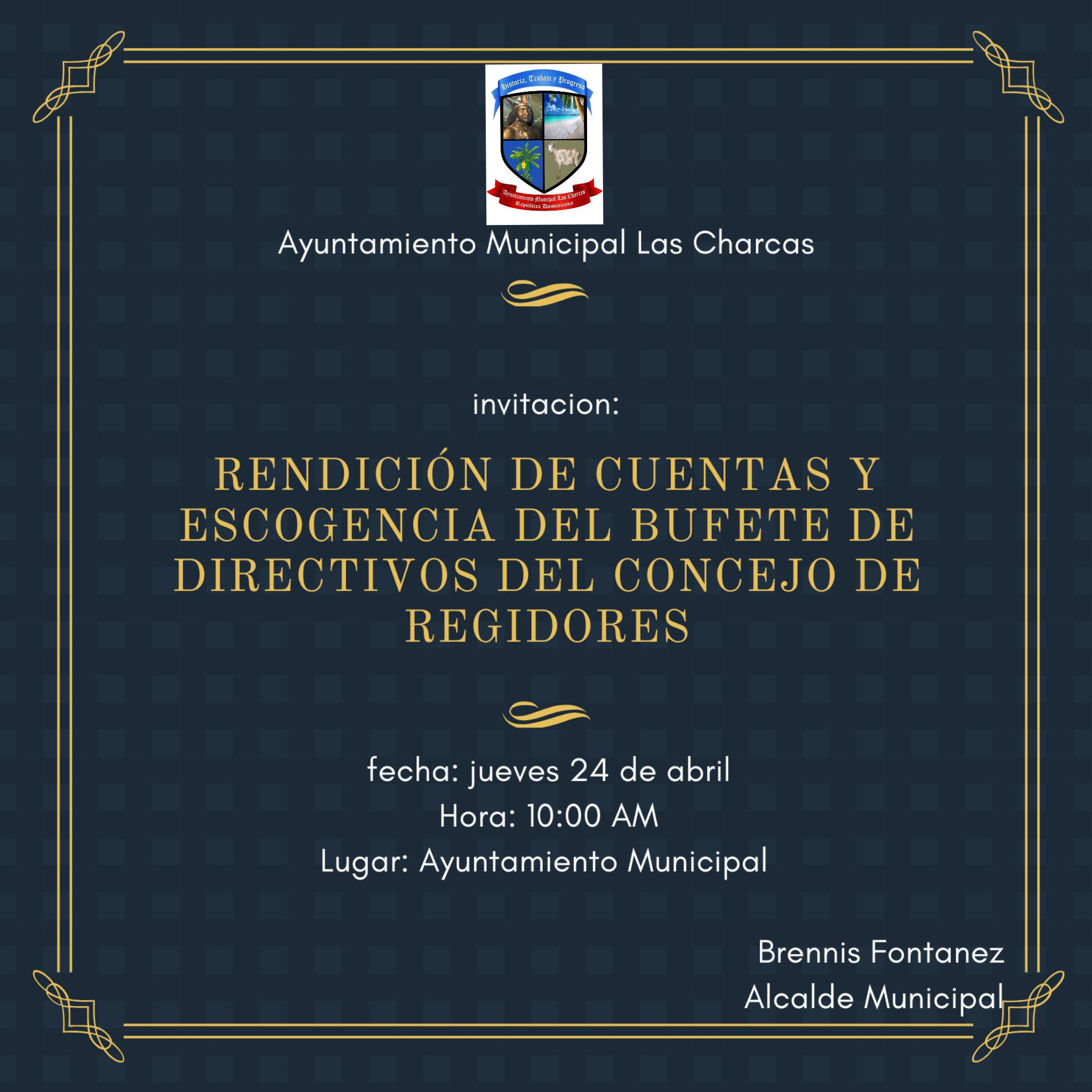 El Ayuntamiento Municipal tiene el honor de invitarles al gran acto de Rendición de Cuentas y escogencia del bufete directivo del Concejo de Regidores.