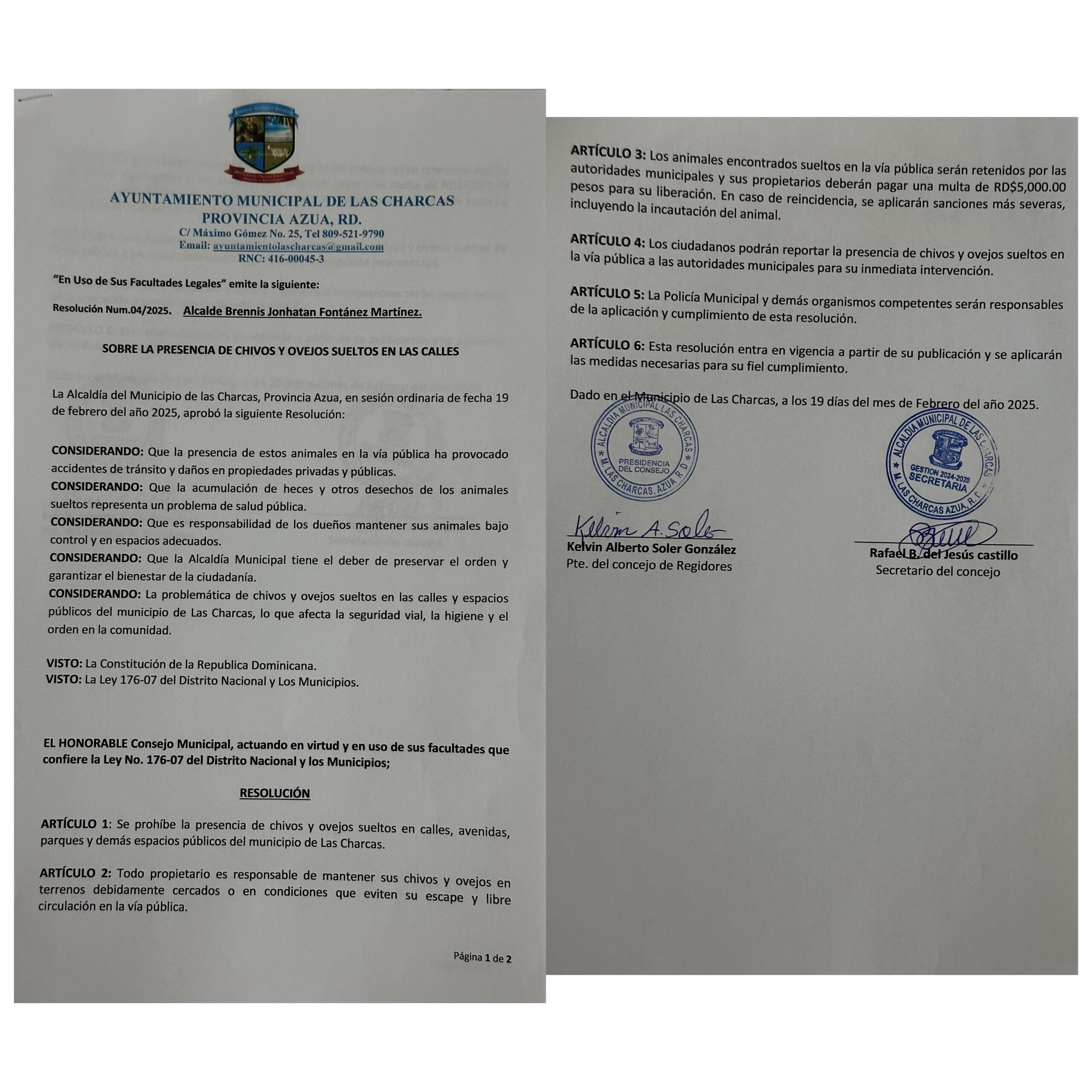 Se hace de conocimiento público que la Sala Capitular ha aprobado una resolución que prohíbe la presencia de chivos y ovejos sueltos en las calles del municipio, debido a los inconvenientes y riesgos que esto representa para la seguridad vial, la salubridad y el orden público.